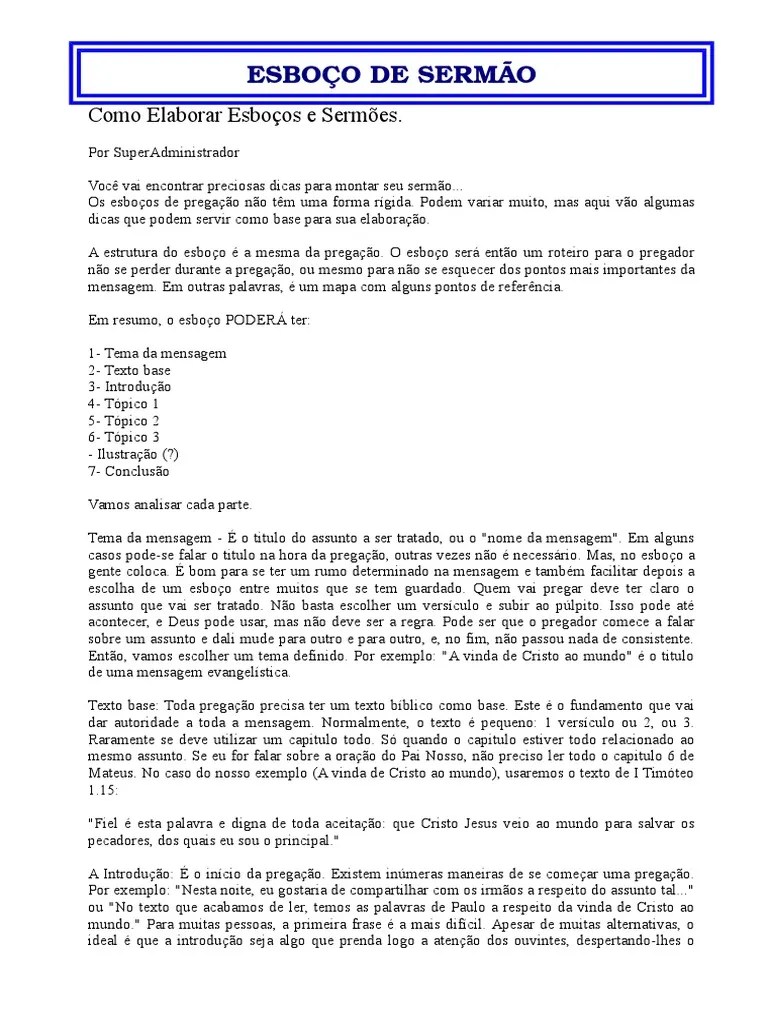 Vida cristã, conselhos e advertências bíblicas. Adão era o cabeça da humanidade perdida. O esboço ajuda ao desenvolvimento de melhor estilo e permite a publicação e reutilização utilizando técnicas. Esse índice contém esboços bíblicos de pregação, que você pode usar sem moderação para desenvolver sua pregação cristã. Vários temas de sermões em pdf para baixar. Vida cristã, conselhos e advertências bíblicas. 5 esboços de sermões bíblicos. Neste site você encontrará diversos esboços de pregação e estudos bíblicos.esse índice de esboços contém uma lista completa de pregações, que você pode usar sem limites no sermão que você irá pregar na sua igreja. (esboço) o que deus pede de nós e qual o resultado de atender o seu pedido (esboço) um menino nos nasceu (esboço de pregação para o culto de natal). Seção de esboços de sermões.